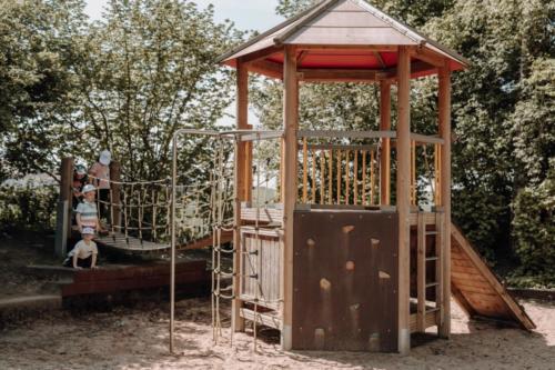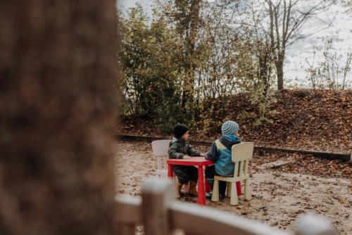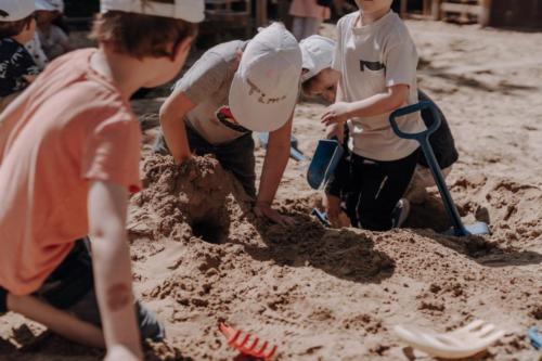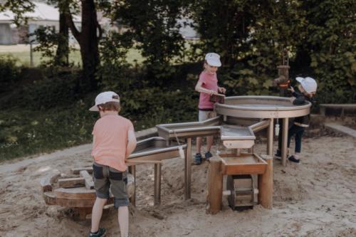 Im Mittelpunkt unseres Außenbereichs steht die große Sandlandschaft mit Wasserspielelementen, großer Rutsche sowie Kletter- und Spielgeräten. Eine große Schaukel, Ballspielbereich und Hochbeete zum Gärtnern stehen den Kindern neben vielen Spielsachen und Fahrzeugen natürlich auch zur Verfügung.